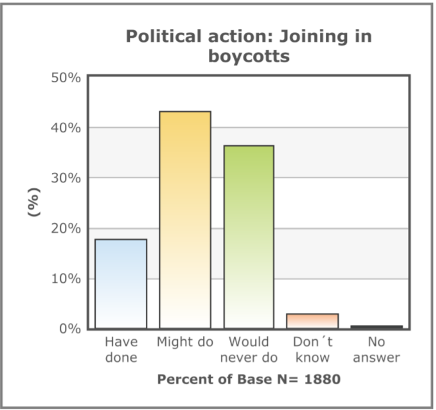 However, in France the political participation of citizens seems to exceed “healthy” boundaries – the population responds with extreme sensitivity to any policies that are deemed to have negative consequences. People are willing to march to the streets, block them, and therefore cause the collapse of the whole infrastructure. More than 70% of the French population either participated or is willing to participate in the demonstration which emphasizes the participant nature of French politics. In addition, more than 60% of French citizens are willing to or participated in boycotts which demonstrates the civic willingness to actively engage in political life.